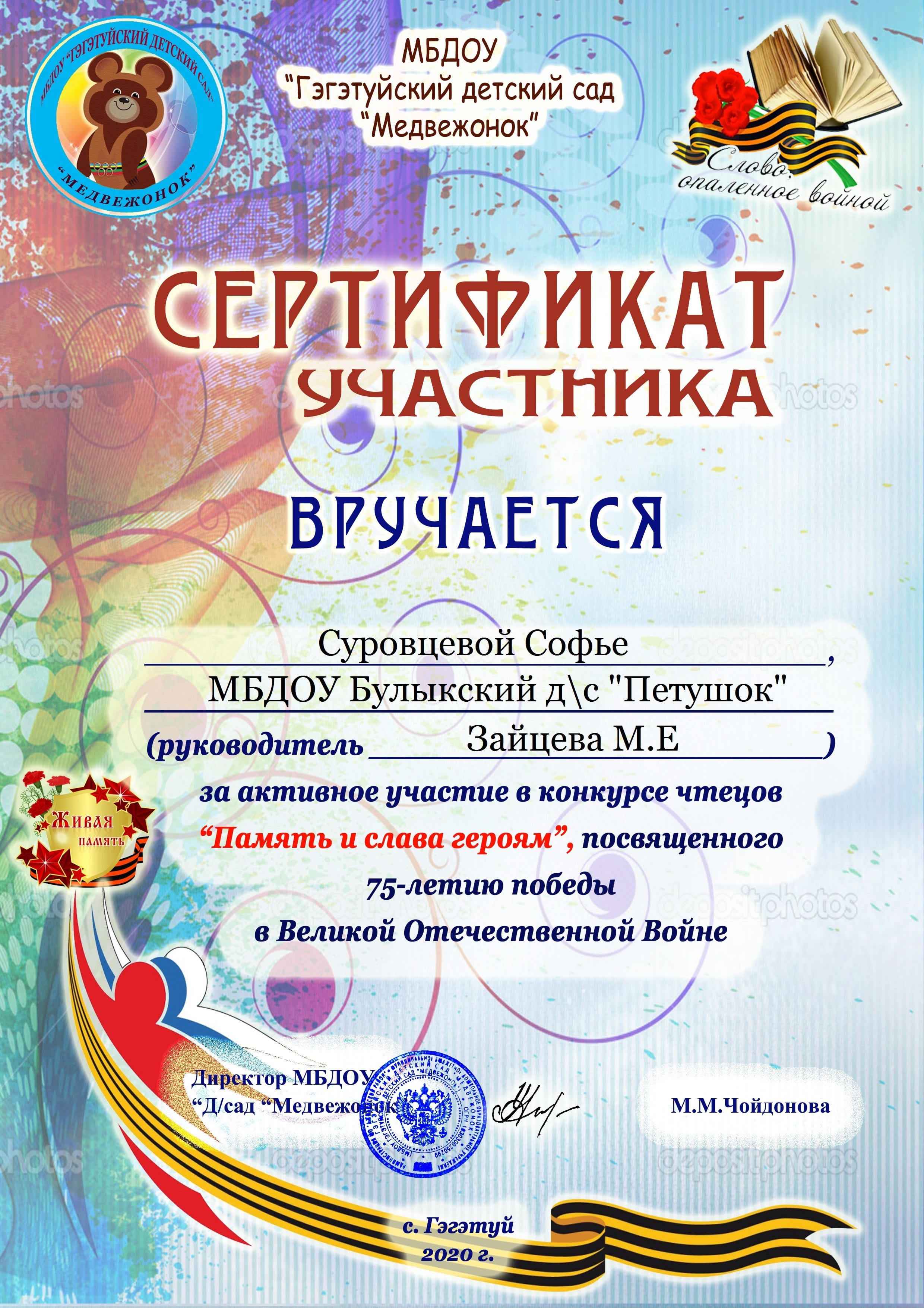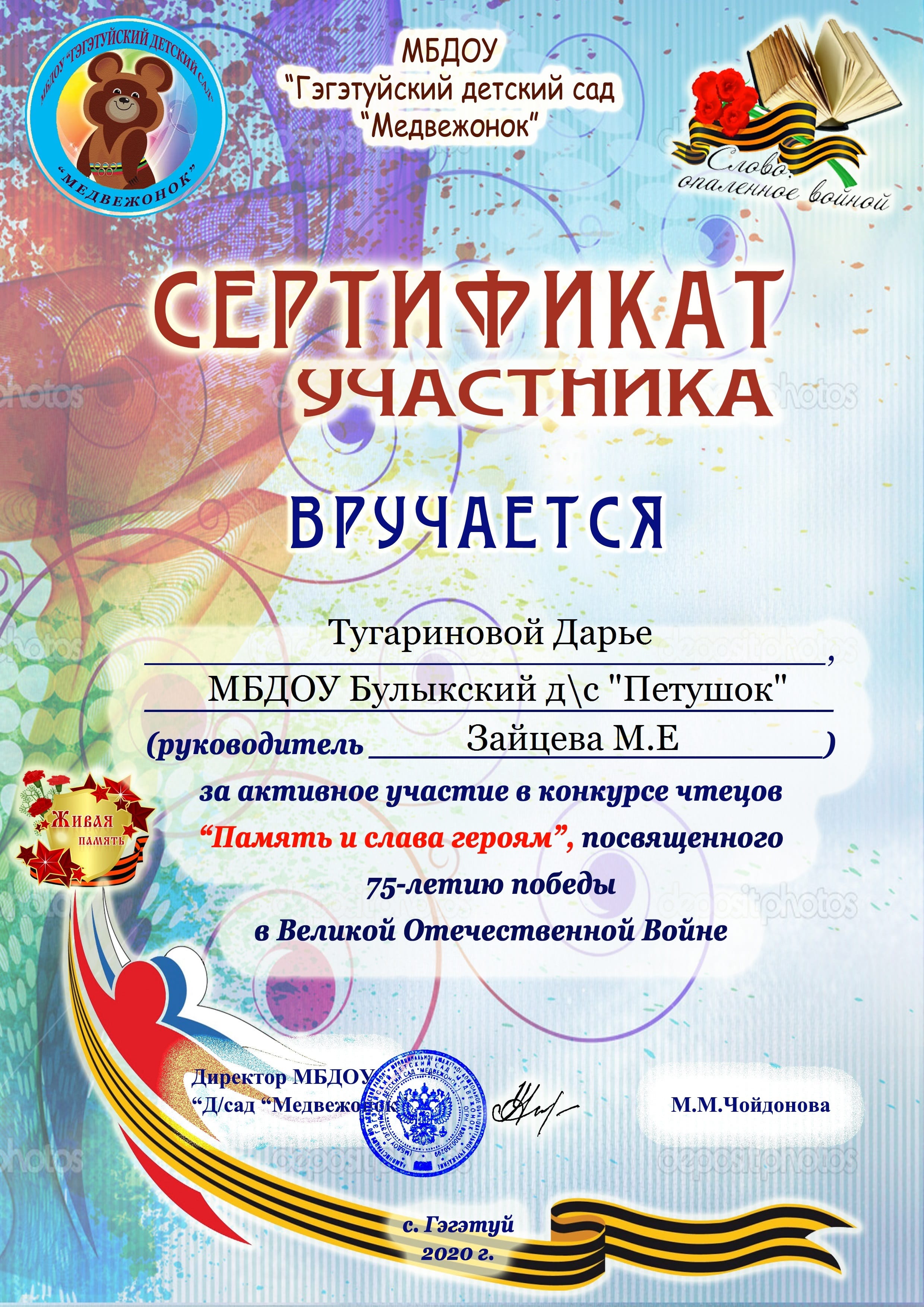 В акции приняли участие воспитанники трех детских садов: МБДОУ Гэгэтуйский детский сад «Медвежонок», МБДОУ Нижне-Бургалтайский сад «Сэсэг» и МБДОУ Булыкский детский сад «Петушок». Здесь дети рассказывали стихи о Великой Отечественной войне. Участникам акции вручены сертификаты.